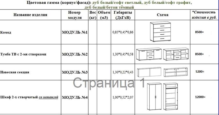 - Цветовая гамма (корпус/фасад): дуб белый/софт светлый, дуб белый/софт графит, дуб белый/бетон тёмный.