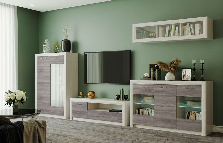 На второй фото гостиная в цвете -фасад Дуб Клабхаус серый, Состав:-37500 руб.