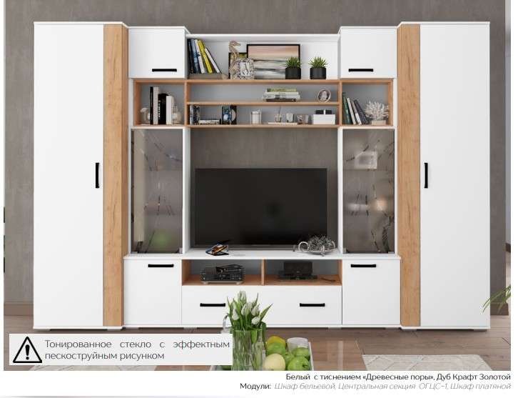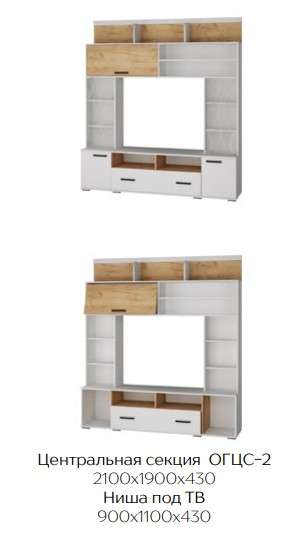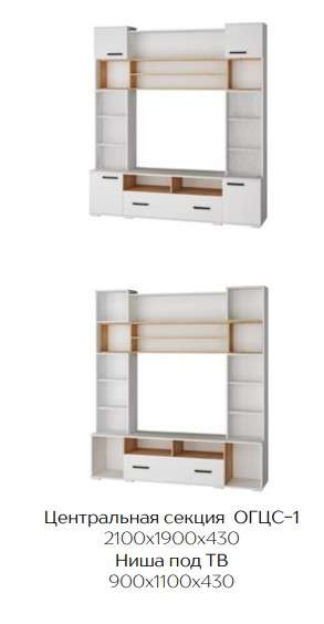 На первой фото в состав гостиной входит : Центральная секция ОГЦС-1, Шкаф бельевой, Шкаф платяной. Цена указана за эту комплектацию -26900 руб..
