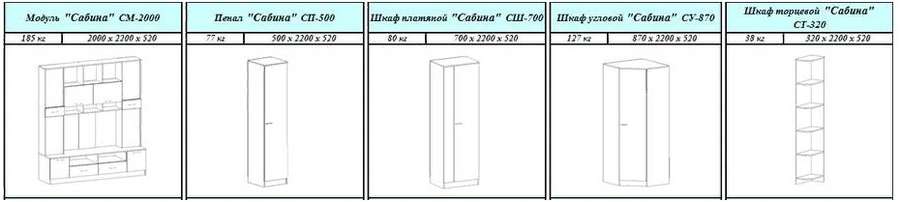 Комплектация: Шкаф торцевой "Сабина"СТ-320, Пенал "Сабина" СП-500, Модуль "Сабина" СМ-2000, Пенал "Сабина" СП-500, Шкаф угловой "Сабина" СУ-870, Пенал "Сабина" СП-500, Шкаф торцевой "Сабина"СТ-320.