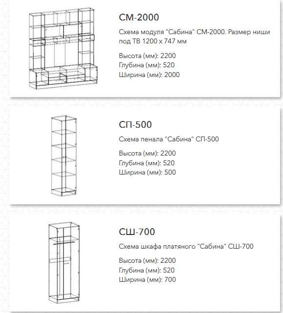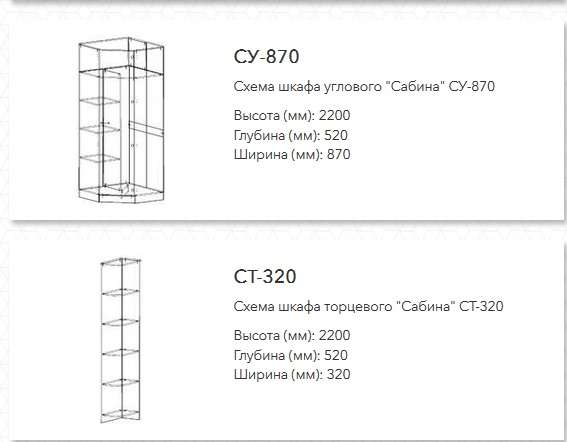 Комплектация: Шкаф торцевой "Сабина"СТ-320, Пенал "Сабина" СП-500, Модуль "Сабина" СМ-2000, Пенал "Сабина" СП-500, Шкаф угловой "Сабина" СУ-870, Пенал "Сабина" СП-500, Шкаф торцевой "Сабина"СТ-320.