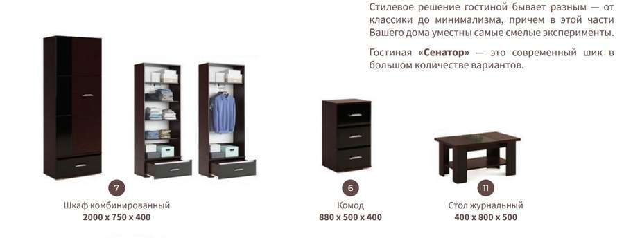 Модульная серия для гостиной «Сенатор» – это мечта любого человека, ведь стоит взглянуть на этот набор мебели достаточно, чтобы понять, что она объединила в себе все лучшие черты, которые может иметь модульная мебель. В дизайне модульной серии для гостиной «Сенатор» мы продолжаем тенденции современного эко-минимализма: простые формы, лаконичные черные фасады и фактура натурального дерева — сочетание весьма актуальное и привлекательное.