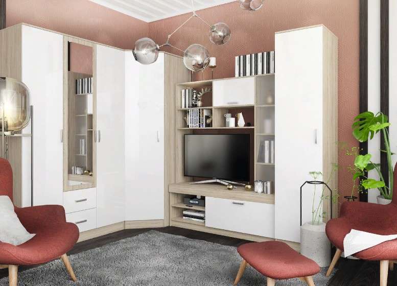 Цена на сайте указана за Комплектацию на фото: Гостиная №1 СЦС 1400.1, Шкаф угловой, Пенал, Шкаф 3-х ств.