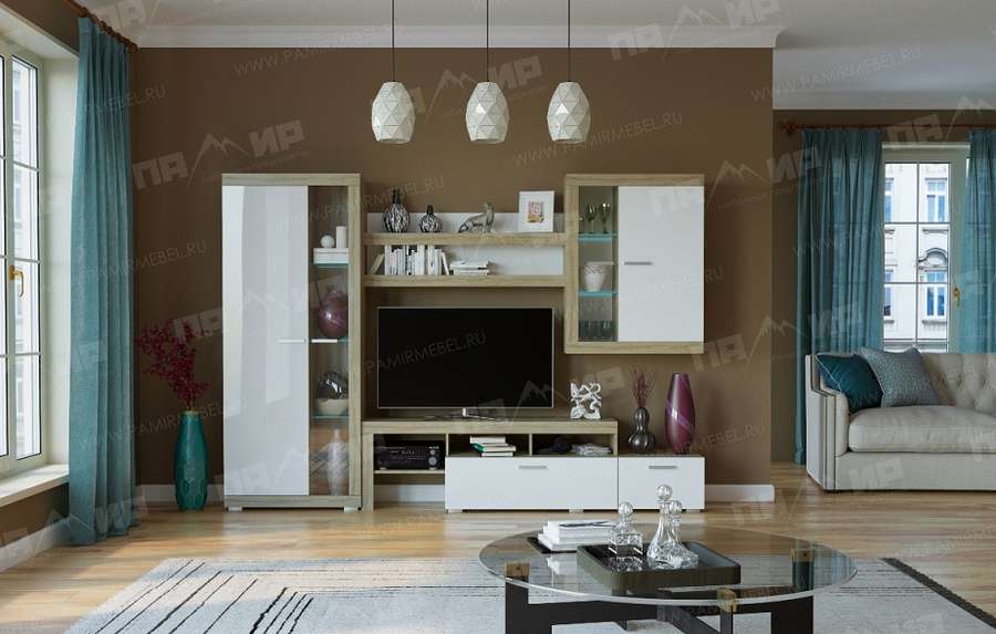 Модульная система для гостиной "Соната" - это современная модульная программа, имеющая в своем составе 7 модулей. В гостиной «Соната» применяются современные европейские декоры: корпус выполнен из ЛДСП «Дуб сонома светлый», фасад из ЛДСП «Белый глянец». Декоры отличаются выраженной тёплой древесной текстурой, а фасадная часть подчёркнута горизонтальными линиями текстуры и стильными планками МДФ, представляющими собой элементы корпуса и фасада.