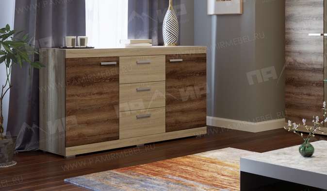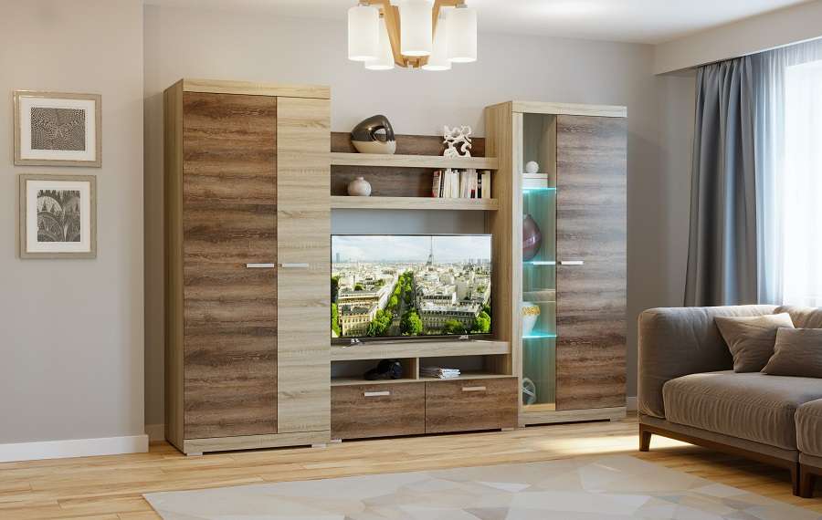 Модульная система для гостиной "Соната" - это современная модульная программа, имеющая в своем составе 7 модулей. В гостиной «Соната» применяются современные европейские декоры: корпус выполнен из ЛДСП «Дуб сонома светлый», фасад из ЛДСП «Дуб сокраменто тёмный». Декоры отличаются выраженной тёплой древесной текстурой, а фасадная часть подчёркнута горизонтальными линиями текстуры и стильными планками МДФ, представляющими собой элементы корпуса и фасада.