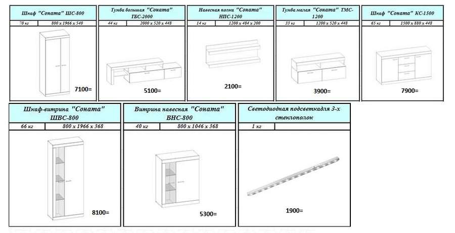 Цена указана за комплектацию на фото: Шкаф "Соната" ШС-800,Тумба малая "Соната" ТМС-1200, Навесная полка "Соната" НПС-1200, Шкаф-витрина "Соната" ШВС-800.