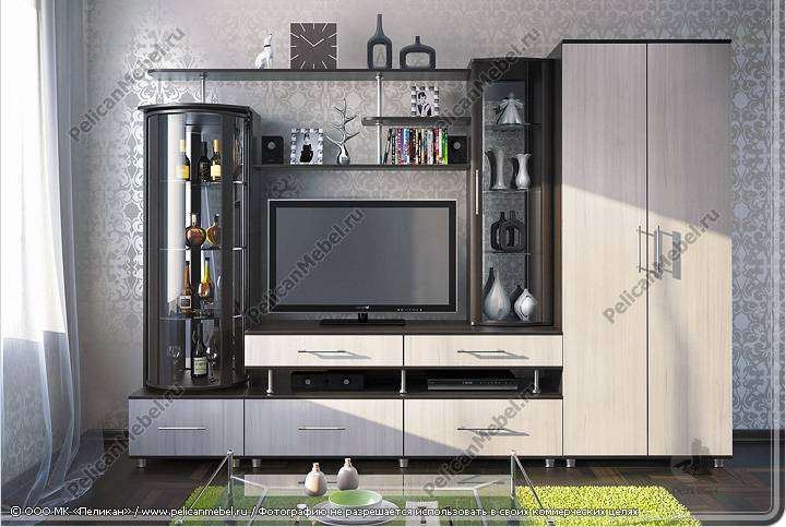 Особенностью модульной гостиной «Техно» является вращающийся бар, что понравится любителям необычных вещей. Гнутое стекло бара, большое количество секций и полок, не только подчеркивают креативность дизайна, но и делают гостиную «Техно» вместительной.