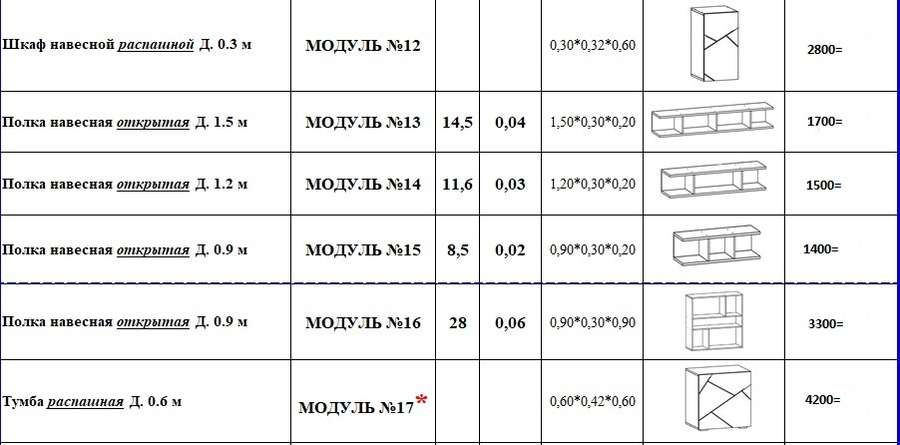 Цена на сайте указана за комплект на фото: Шкаф с выдвижной штангой, Шкаф навесной барный Д. 0.9 м - 2шт., Полка навесная открытая Д. 1.5 м, Тумба Д. 1.2 м с 2-мя ящиками, Тумба Д. 0.6 м с 2-мя ящиками, Тумба распашная Д. 0.6 м - 2шт.