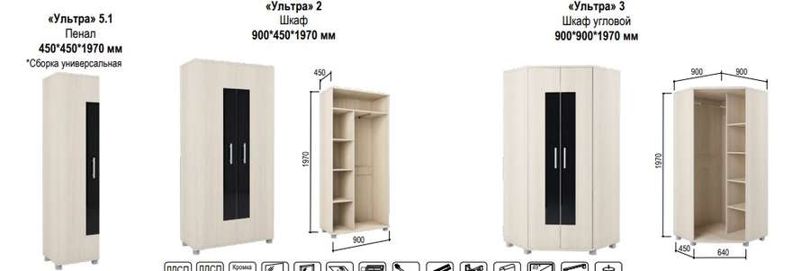 Шкаф для одежды №2 «Ультра» Современный дизайн, оригинальная фурнитура, интересное цвето-фактурное решение модульной системы "Ультра" создадут уютный и неповторимый интерьер в Вашей гостиной. Материал : ЛДСП Фасад : ЛДСП +черное стекло с фацетом Цвет : Шимо светлый. Размер...