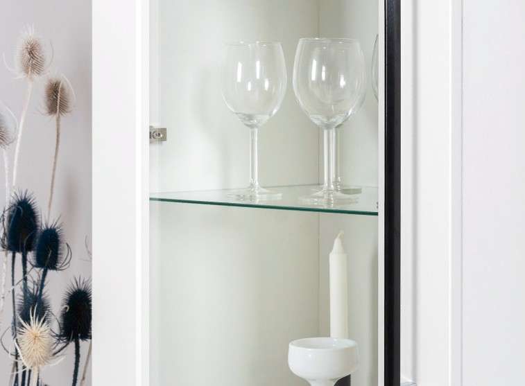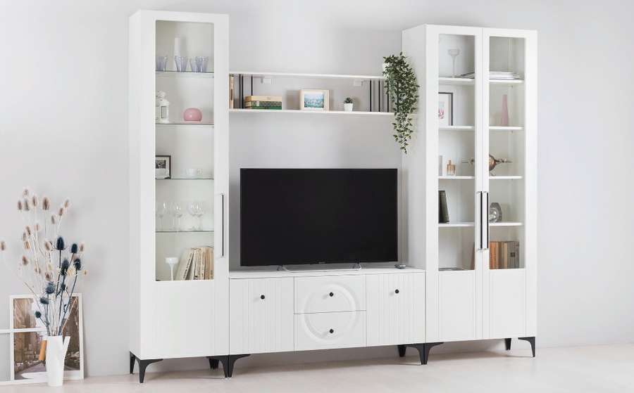 Светлая стильная гостиная в стиле ар-деко, логическое продолжение популярной спальни. Контрастное, графичное и стильное сочетание черного и хромированных деталей эффектно расставляет акценты на мебели. Геометричный рисунок фрезеровки даёт развитый светотеневой рисунок. Все выдвижные ящики и петли оснащены доводчиками. Полки книжного шкафа имеют регулировку по высоте.