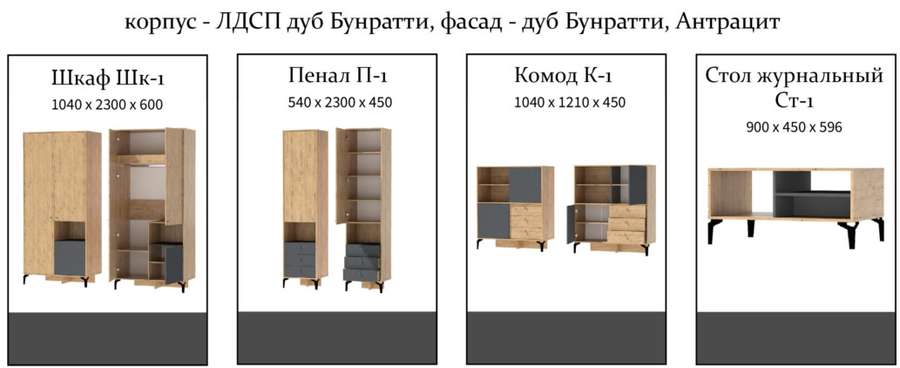 - Цвет: Корпус Дуб Бунратти/ Фасад Антрацит.