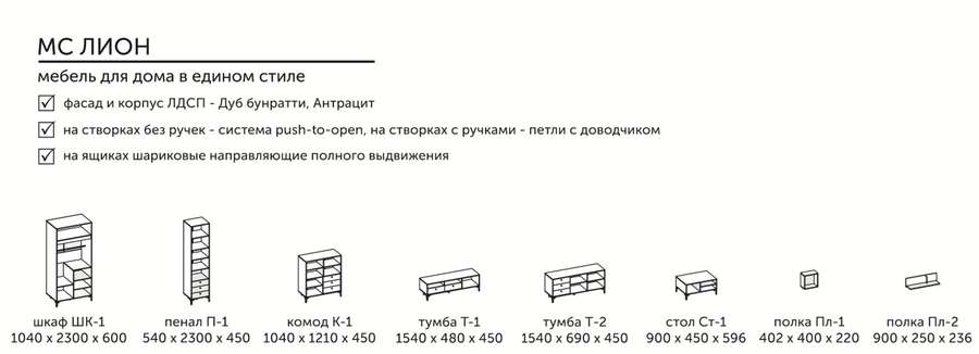 - МС «Лион» — петли с доводчиком, направляющие полного выдвижения, створки цвет Антрацит в модулях ШК 1, К1, Т1, Т2 открываются нажатием, на них нет ручек.