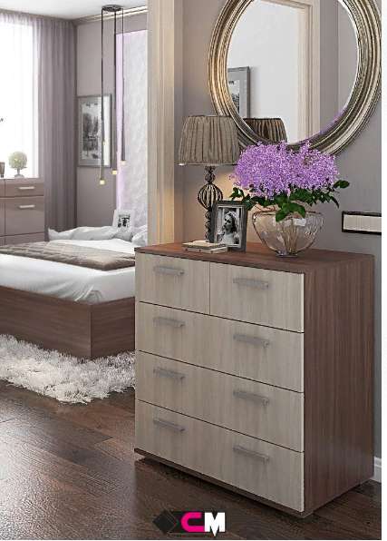 Пять выдвижных ящиков пригодятся для хранения одежды, постельного и нижнего белья, различных аксессуаров, косметики и украшений. Сверху на комоде можно разместить интересные книги, семейные фотографии, вазу или вазон с цветами, статуэтки и другие предметы декора.