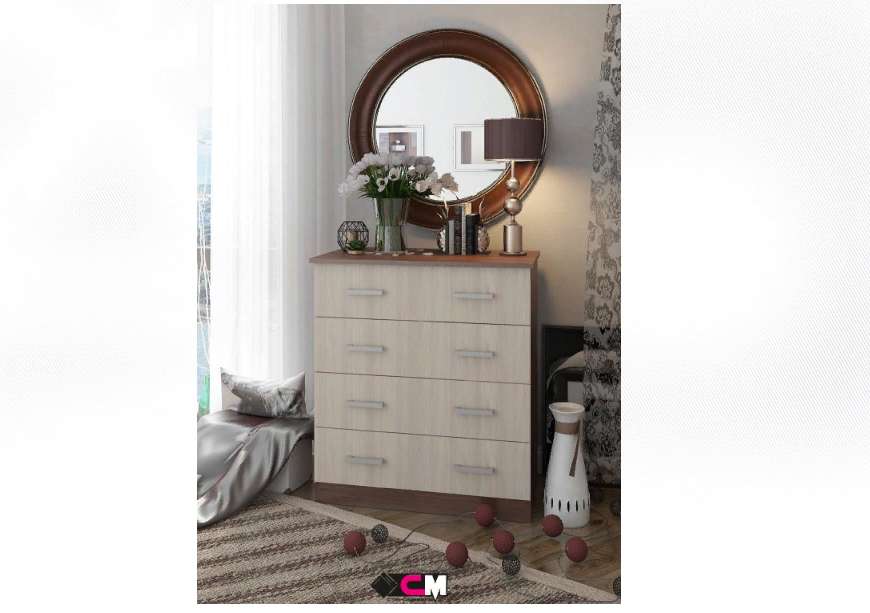 Четыре достаточно вместительных выдвижных ящиков пригодятся для хранения одежды, постельного и нижнего белья, различных аксессуаров, косметики и украшений. Сверху на комоде можно разместить интересные книги, семейные фотографии, вазу или вазон с цветами, статуэтки и другие предметы декора.