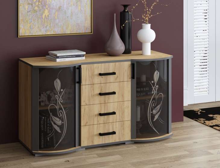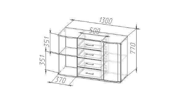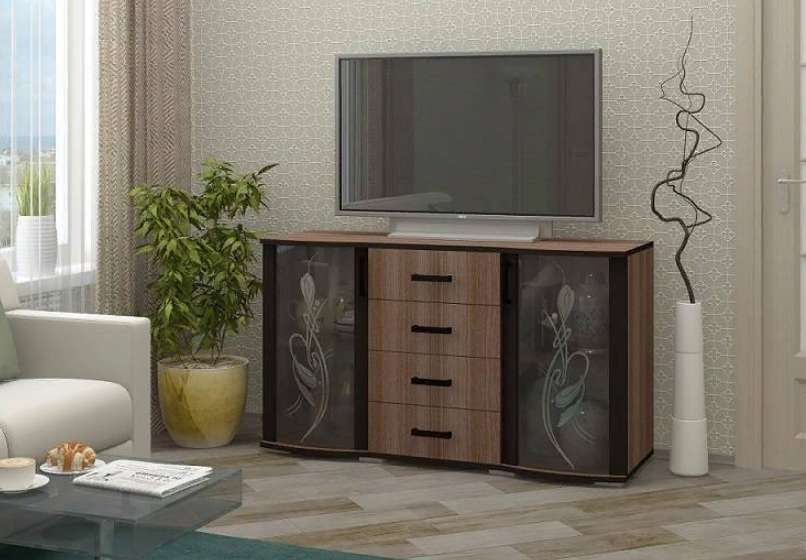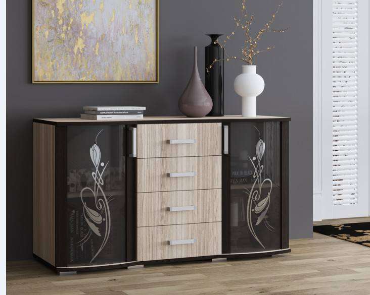 Направляющие — роликовые, неполного выдвижения. В данном комоде используются новые оригинальные ручки, дополняющие и подчеркивающие дизайн конструкции. Стекло с рисунком придает изделию элегантности. Может использоваться в качестве комода и тумбы под ТВ.
