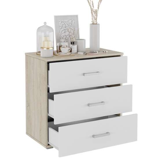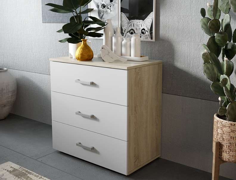 Комод с тремя ящиками заинтересует тех, кто не располагает большими и просторными помещениями.