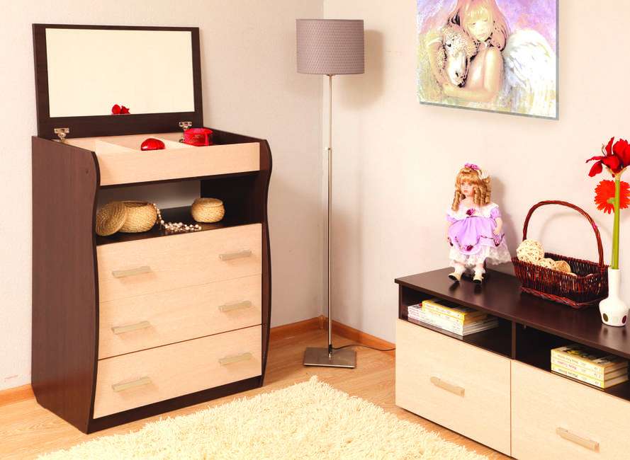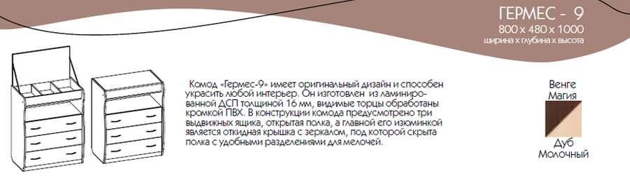 Комод «Гермес-9» имеет 3 выдвижных ящика,открытую полку, а также скрытую полку под откидной крышкой с зеркалом.