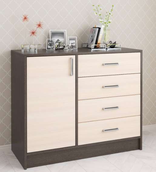Комод с двумя секциями: отделение с распашным фасадом и выдвижные ящики. Выдвижные ящики установлены на роликовых направляющих.