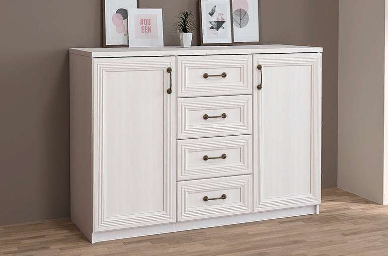 Комод с четырьмя выдвижными ящиками и двумя закрытыми нишами с полками внутри - удобная и полноценная система хранения, идеально подходящая для любого помещения: спальни, гостиной, рабочего кабинета, детской. В нём можно хранить текстиль, постельные принадлежности, нижнее бельё, косметику, документы, детские игрушки, а столешницу использовать как функциональную полку для приятных мелочей: статуэток, красивых ваз, светильника, семейных фотографий.