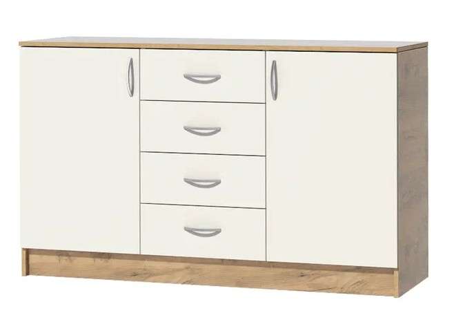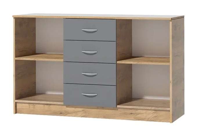 Комод из модульной коллекции КЭТ-7, выполнен в модной цветовой гамме. Комод с четырьмя выдвижными ящиками и двумя закрытыми нишами с полками внутри - удобная и полноценная система хранения, идеально подходящая для любого помещения: спальни, гостиной, рабочего кабинета, детской. В нём можно хранить текстиль, постельные принадлежности, нижнее бельё, косметику, документы, детские игрушки, а столешницу использовать как функциональную полку для приятных мелочей: статуэток, красивых ваз, светильника, семейных фотографий.