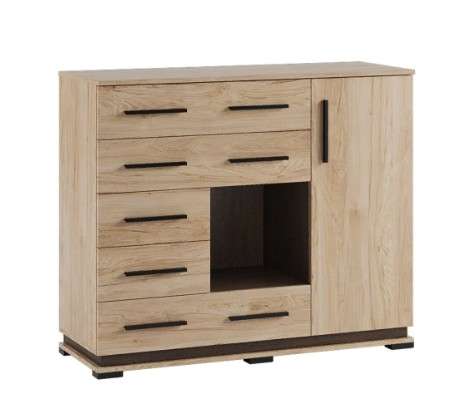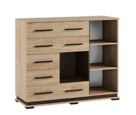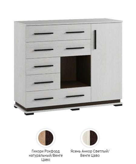 Высокий комод со столешницей шириной 120 см, на которой Вы с комфортом разместите книги, предметы декора и памятные вещицы. Комплект ящиков на шариковых направляющих полного выдвижения пригодится для журналов, небольших коробок. Открытая ниша в центре комода цвета Венге Цаво отлично подойдет для тех предметов, которые необходимо иметь под рукой. Секция с полками за глухим фасадом подарит дополнительное пространство для хранения вещей.