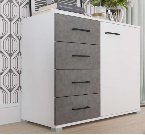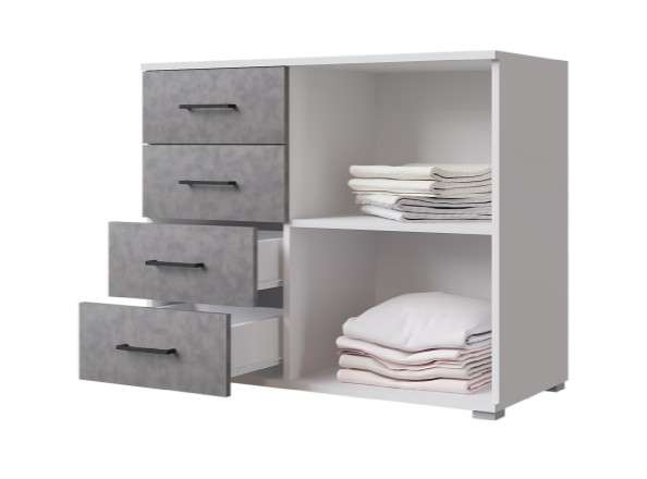 Комод разделен на 2 части: слева ящики, справа отделение с полкой. Материал ножек - пластмасса, регулируемые. Материал ручек - пластмасса, на ощупь бархатные.