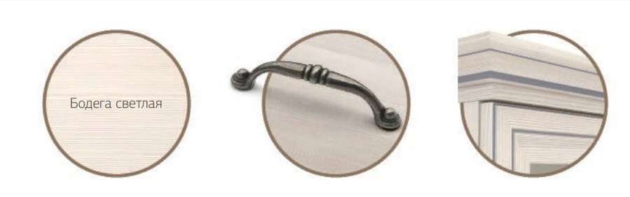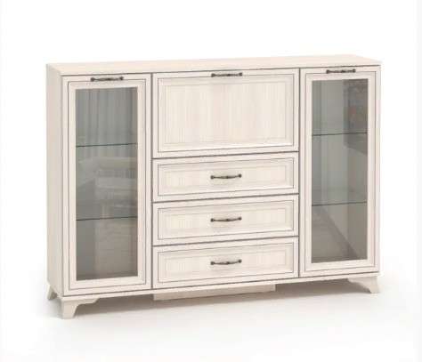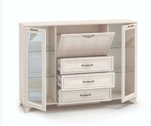 Слева и справа за стеклянными дверцами симметрично расположены секции, в каждой из которых имеется по две полки. Посредине в верхней части размещается отделение с откидной створкой. А снизу в центральной части тумбы находятся три глубоких выдвижных ящика. Изделие опирается на небольшие, но устойчивые ножки.