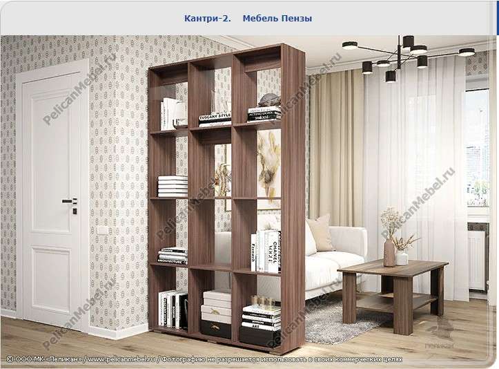 Стеллаж «Кантри-2» может служить своеобразным разграничителем рабочей зоны и зоны отдыха, столовой от кухни, он выполняет функцию зонирования пространства, а это очень актуальный тренд в современном интерьере.