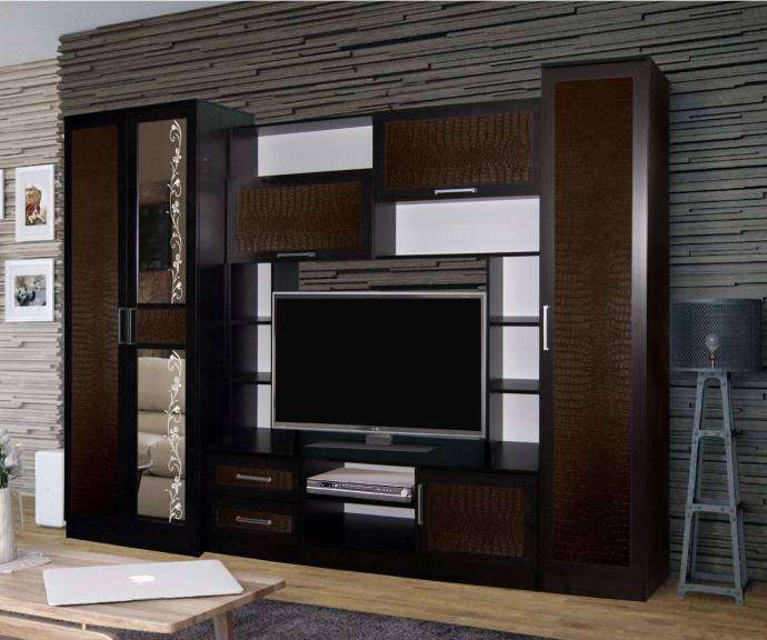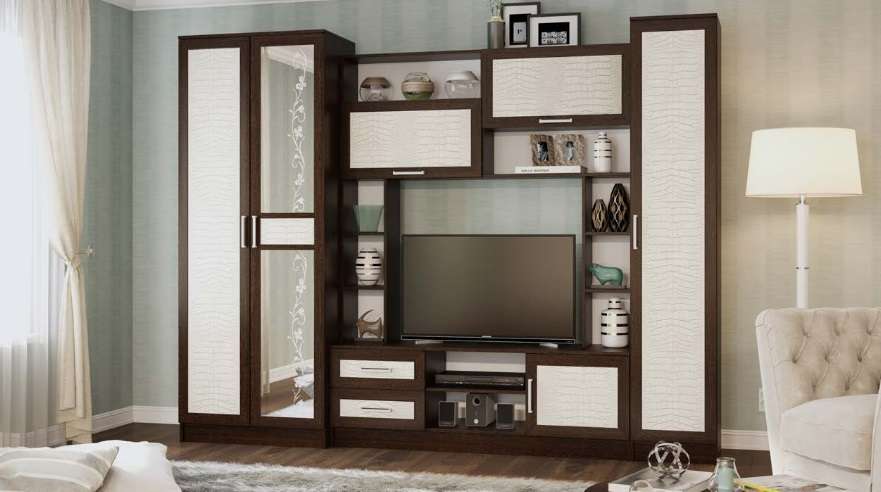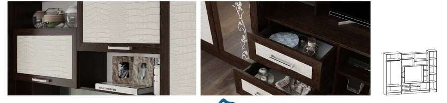 Двухцветная гостиная «Флора-2» привлекает своей простотой и универсальностью. Беспроигрышная комбинация натуральных оттенков подходит абсолютно к любому цветовому оформлению интерьера. Изящный растительный орнамент на зеркале, несимметричность конструкции, а также поверхности фасадов с фактурой под крокодиловую кожу делают комплект стильным и уникальным.