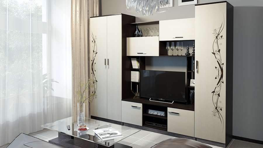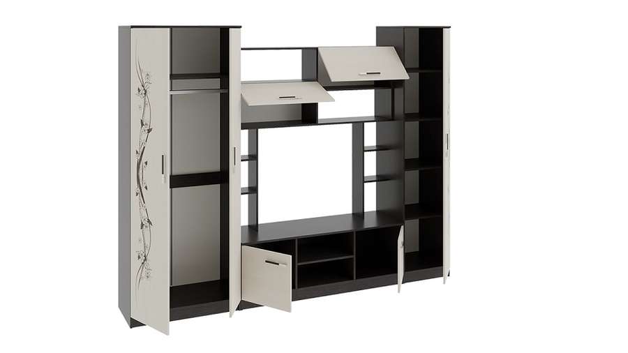 Красивая стенка для гостиной с двумя шкафами для размещения множества вещей и одежды. В одном шкафу полки, в другом-штанга.