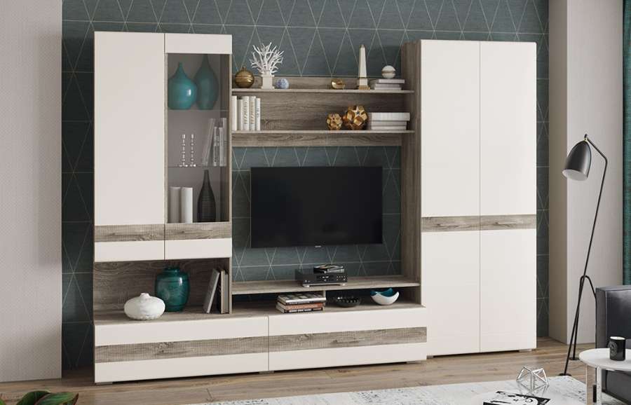 Красивая стенка для гостиной с вместительным шкафом для размещения множества вещей и одежды.
