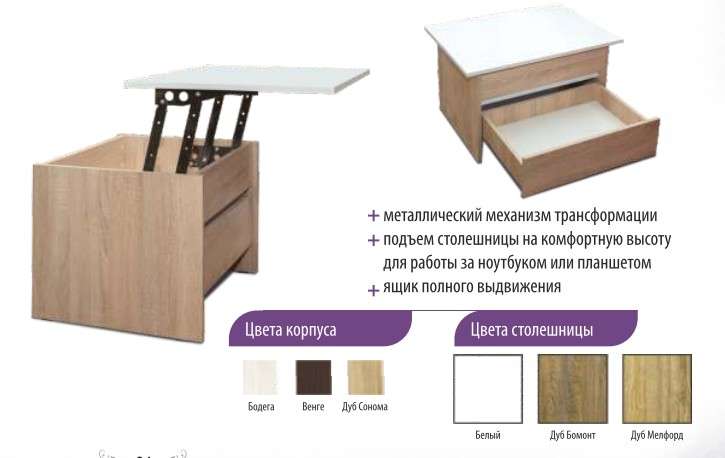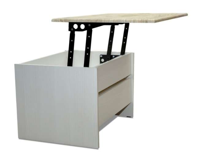 Удобный журнальный стол-трансформер с выдвижным ящиком.Высота подъема столешницы позволит комфортно работать за ноутбуком сидя на диване, а также расположить снэки и напитки при просмотре любимого фильма.Под столешницей располагается удобная ниша для хранения.Внизу располагается удобный и вместительный выдвижной ящик.Выдвижение ящика легкое и плавное, благодарая установленным направляющим скрытого монтажа полного выдвижения.Механизм подъема надежный и прочный, для плавности хода механизм снабжен газ-лифтами.