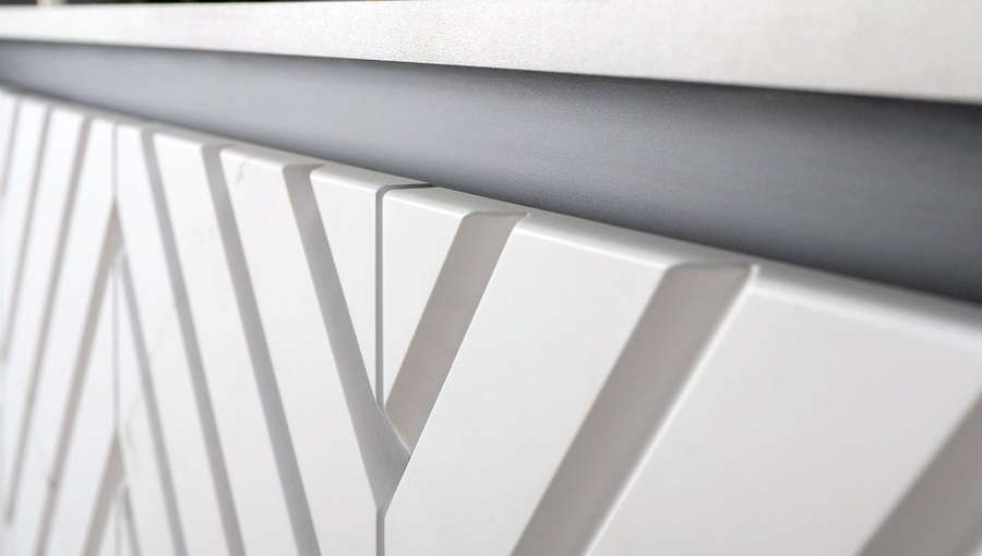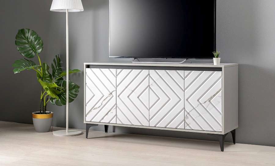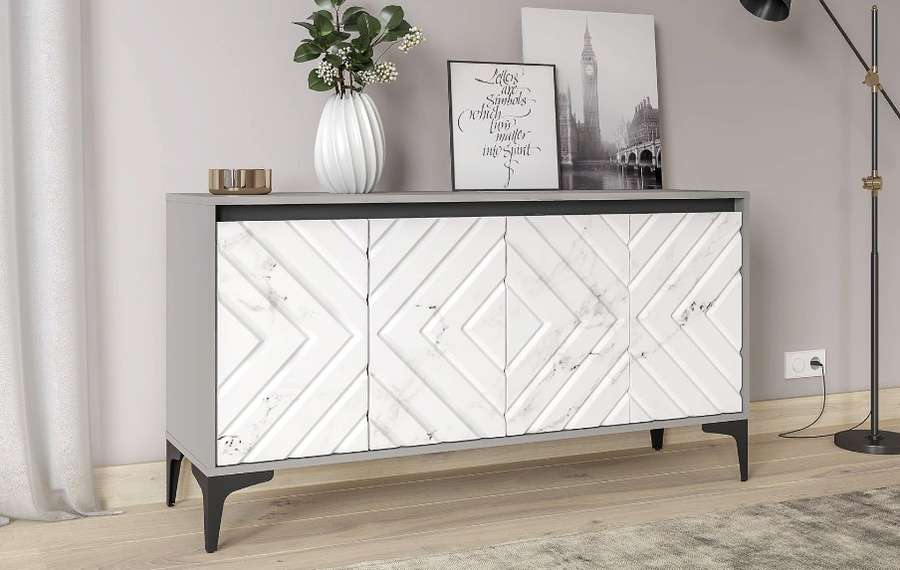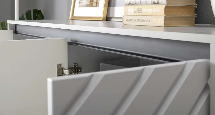 Компактное и стильное решение для гостиной. Светлый серый цвет корпуса является аккуратным обрамлением для фасадов с мраморным декором. Фасады открываются за верхний край.