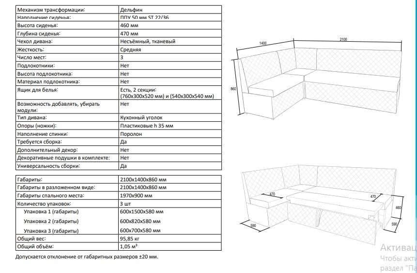 - Габариты в разложенном виде: 2100х1400х860 мм