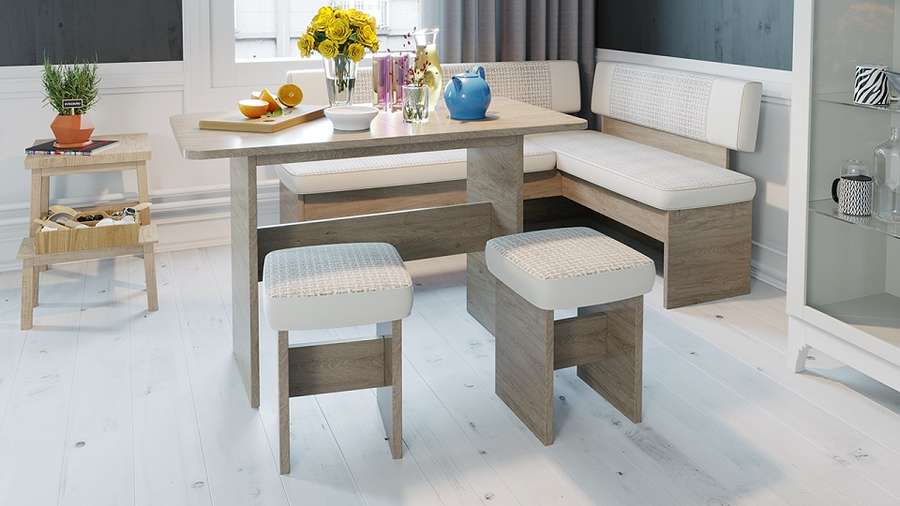 Кухонный уголок «ДУБЛИН» модульныйКухонный уголок Дублин состоит из углового диванчика, Стола раздвижного и двух банкеток (табуретов). Материал: ЛДСП, Обивка Искусственная кожа, Рогожка. Цвет: Дуб Сонома трюфель/Кожзам светлый, ткань светлая. Размер скамьи : Ширина 1575 мм, Глубин...