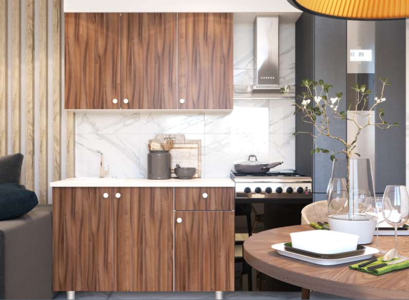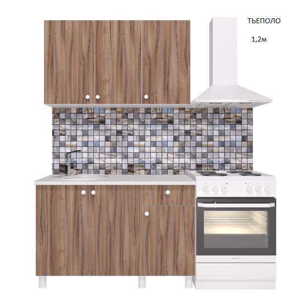 Кухня размером 1,2м . Шкафы поделены на два отделения 80 и 40 см. Рекомендована установка сушки 80 см. Возможно врезать мойку. Вылет столешницы можно менять.