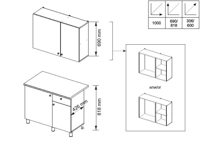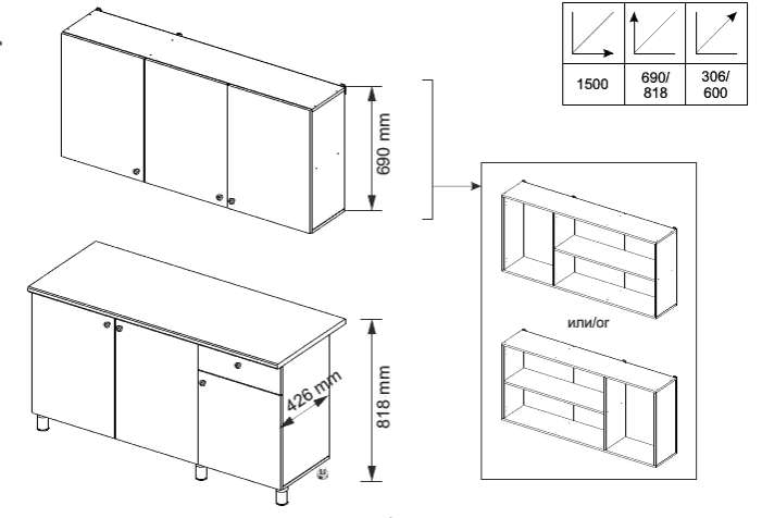 Высота верхних шкафов- 690мм, Высота нижних шкафов - 818мм, Глубина верхних шкафов - 306мм, глубина нижних шкафов - 600мм.