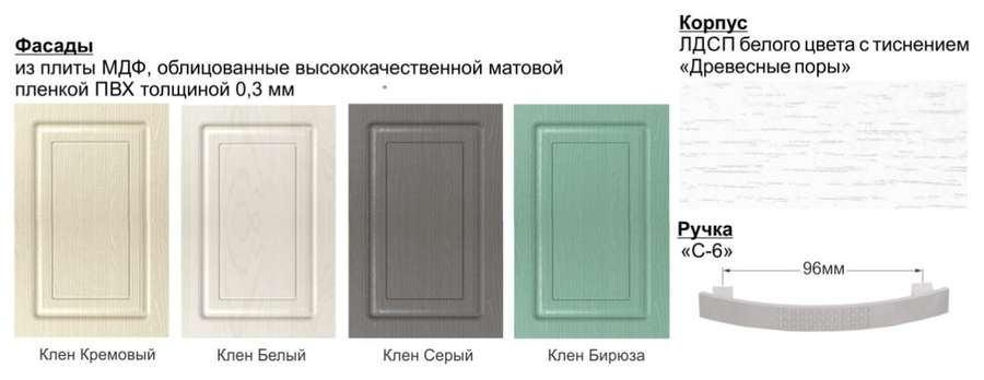 - Материал: Корпус из ЛДСП белого цвета с тиснением «Древесные поры», фасады из плиты МДФ, облицованные высококачественной матовой пленкой ПВХ толщиной 0,3 мм.