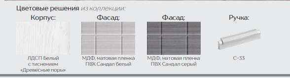 Материал: Корпус: ЛДСП Белый с тиснением «Древесные поры», Фасад МДФ Сандал белый/Сандал серый.
