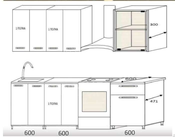 В комплектацию входит: Верх шкафы - Шкаф 600, Шкаф 600, Шкаф 600 со стеклом, Низ столы - Мойка 600, Стол 600, Стол 600 ящик + створка.