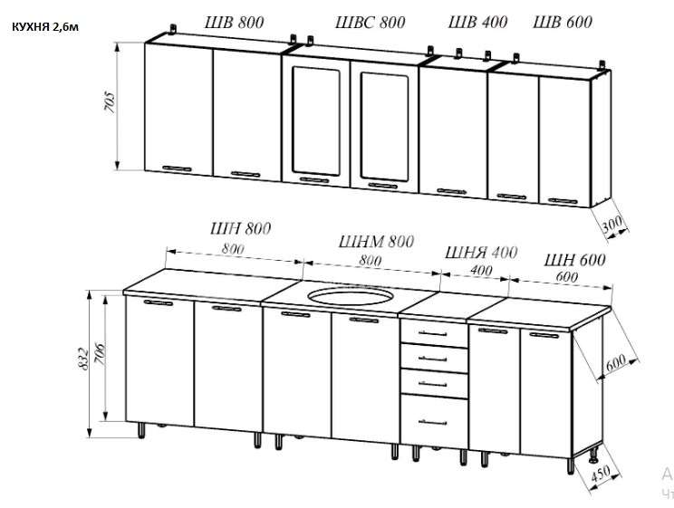 - Размер 2,6м : ШВС 800, ШВ 800, ШВ 600, ШВ 400,ШН 800, ШН 800, ШН 600, ШН 400 с ящиками. Цена-30900 руб.