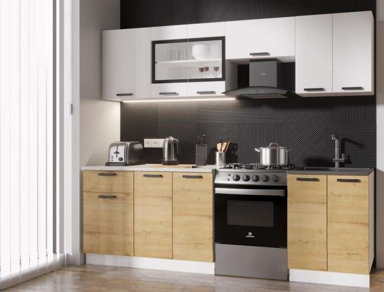 Кухонный гарнитур «Хозяюшка» ЛДСП 2,4м станет идеальным решением для небольшого помещения. Лаконичные фасады с контрастными ручками отлично смотрятся в современных интерьерах в скандинавском стиле или стиле эко. Гарнитур не занимает много пространства, при этом вмещает всю необходимую посуду и утварь.