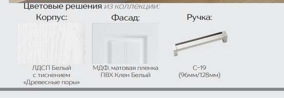 Материал: Корпус: ЛДСП Белый с тиснением «Древесные поры», Фасад МДФ Клен Белый/Клен Белый и Клен Кремовый/Клен Серый.