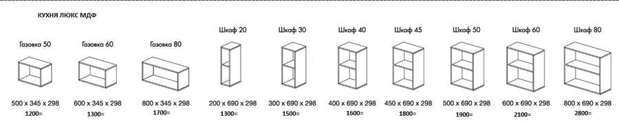 - Модули 600, 800 применяются как шкафы под глухие створки, так и под стеклостворки. Столы 50, 60 и 80 также используются как мойки.