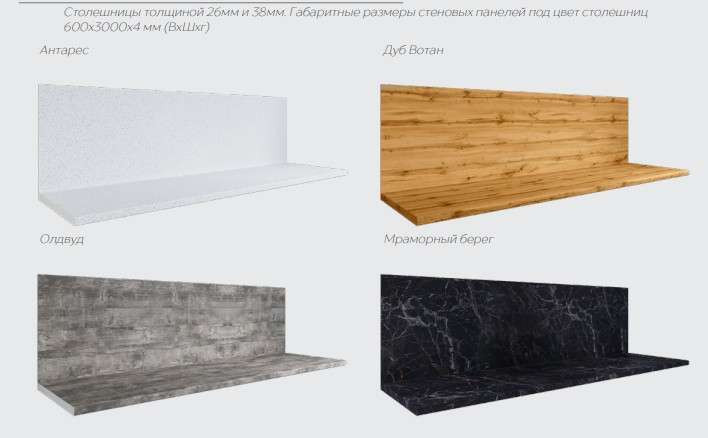 Столешницы 26мм -Антарес, Мраморный берег, Олдвуд, Дуб Вотан.