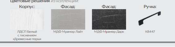 Материал: Корпус: ЛДСП Белый с тиснением «Древесные поры», Фасад МДФ Мрамор Лайт/Мрамор Дарк.