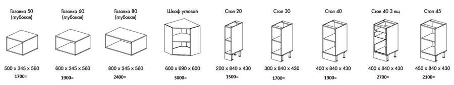 - Модули 600, 800 применяются как шкафы под глухие створки, так и под стеклостворки. Столы 50, 60 и 80 также используются как мойки.