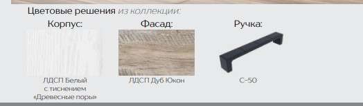 Материал: Корпус: ЛДСП Белый с тиснением «Древесные поры», Фасад ЛДСП Дуб Юкон и Ясень Анкор светлый.