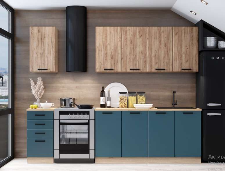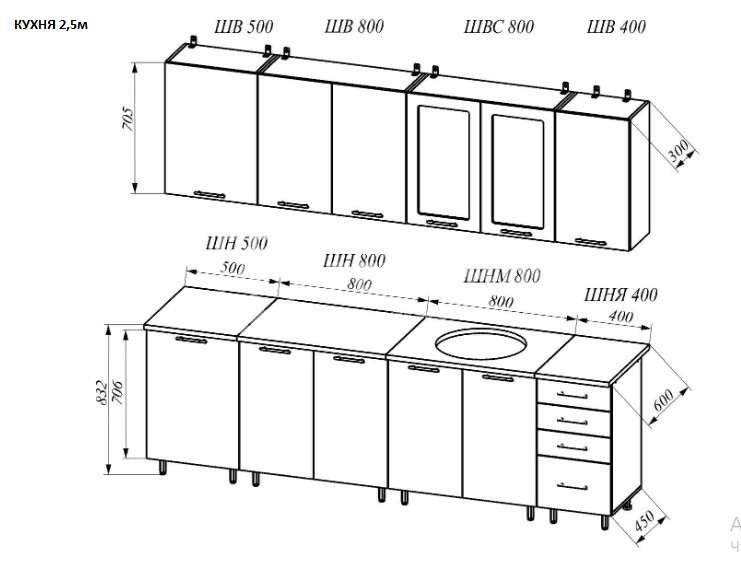 - Высота верхних шкафов: 705, глубина: 300 (с учетом створок).