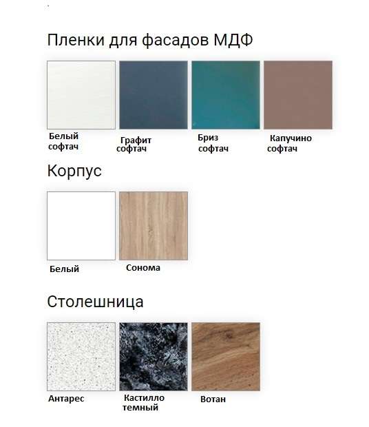 - Фасад : Дуб крафт табачный, Белый софтач,Графит софтач, Бриз софтач, Капучино софтач.